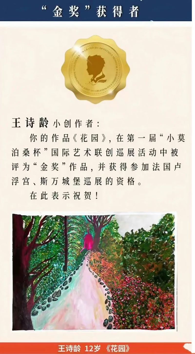 都知道王詩齡爺爺是畫家,而父親王岳倫從小也學畫,在這種優良基因遺傳下,Angela自小也很會畫,12歲時更獲得了“小莫泊桑杯”國際藝術聯創巡展的金獎,更在法國盧浮宮等地展出過!