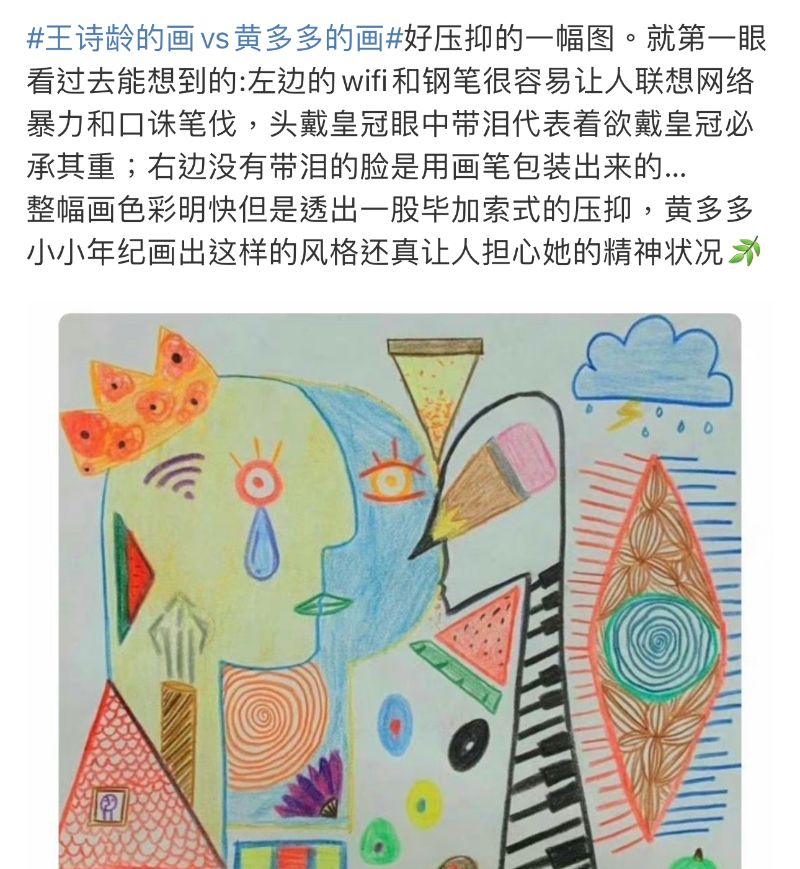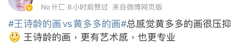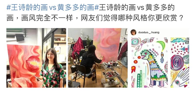 結果,沒想到隨後就有一條「王詩齡的畫VS黃多多的畫」登上熱搜第一,引來不少爭議。原來是有網友把王詩齡和黃多多的畫作,放在一起比較,想讓大家評評看誰的好,結果沒想到招惹了一場罵戰,有些不理智的網友直接進行了拉踩。