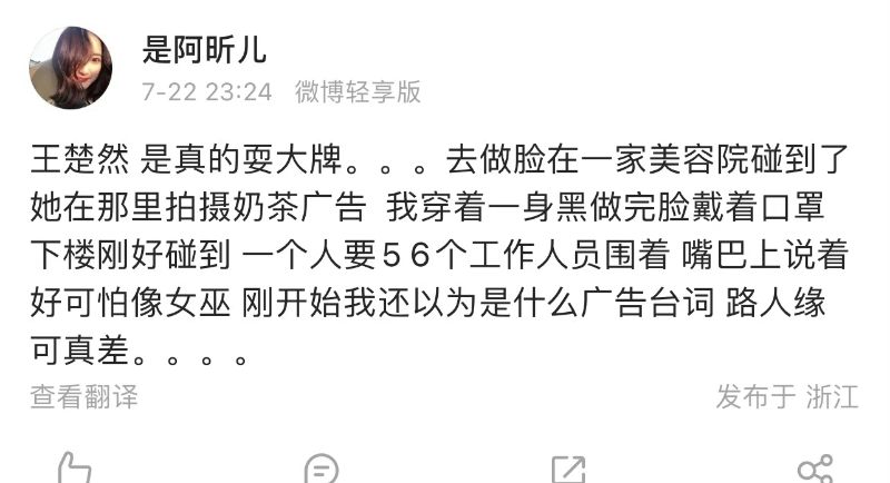 雖然但是,也有不少網友認為這些都是小作文,無憑無據,那就來看看這位被網友稱為「富婆網友」的素人爆料吧!早在7月22日,這位網友就發文,帶大名表示王楚然耍大牌,自己在美容院時,剛好碰到她在拍攝奶茶廣告,由於原Po當時穿著一身黑+口罩,被王楚然吐槽「像女巫」👇