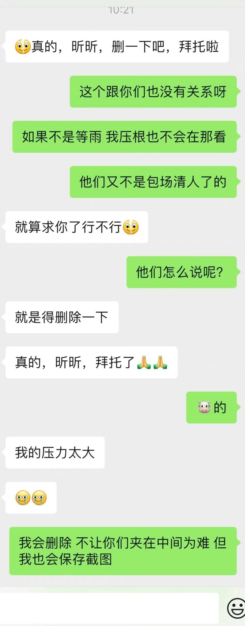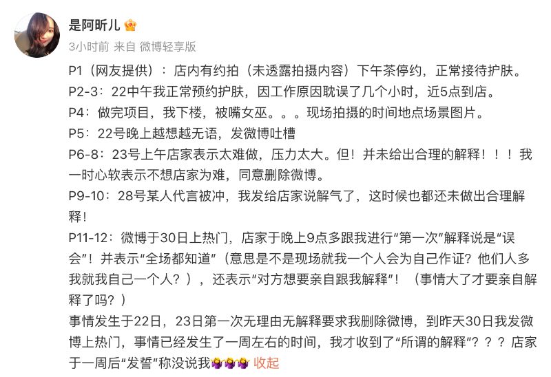 曬出了美容院院長要求自己刪博的聊天截圖👇