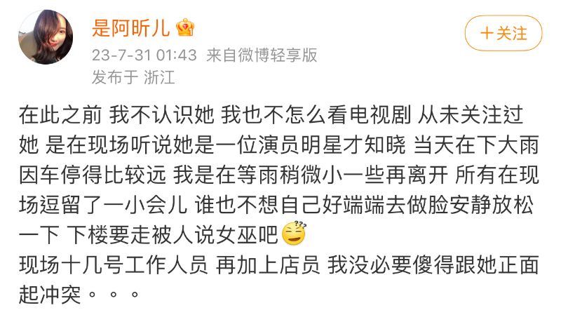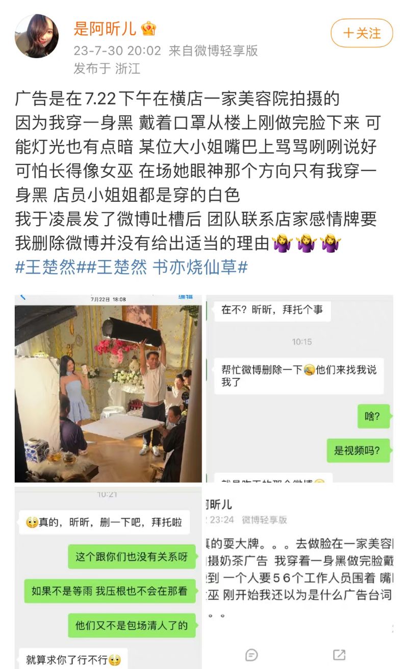 當時就有不少粉絲要求原Po曬證據,別只會寫小作文,原Po真的要錘給錘,發文曬證據解釋了整個事發過程,還公開了該照片的確是在7月22日拍攝的。當時原Po在橫店美容院做美容,剛好碰到了在拍攝的王楚然,結果被王楚然罵罵咧咧說:「好可怕,長得像女巫」!隨後自己發文吐槽之後,王楚然團隊聯繫店家要求原Po刪博,也沒有給出適當的理由👇