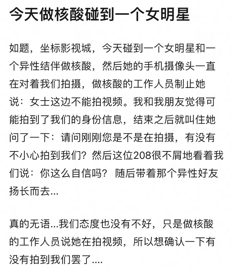 除了因為角色被討厭,也有不少網友出來指控王楚然過往的言論,像是早在2022年時有個女藝人被爆料,做核酸時陰陽怪氣路人:「你這麼自信的嗎?」