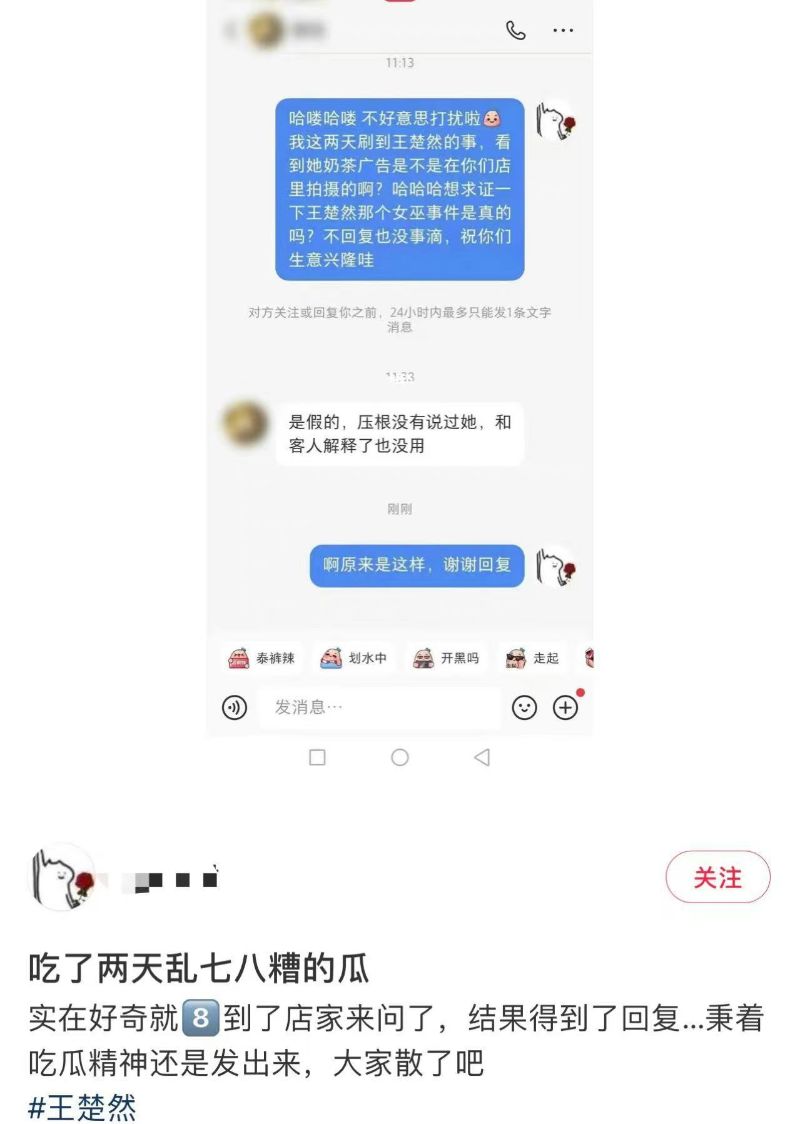 但隨著上了熱搜,店家再pm原Po表示王楚然沒有說她是女巫,但說王楚然方想和她解釋,只不過這是在事發一周、並且無理由要求原Po刪帖之後👇