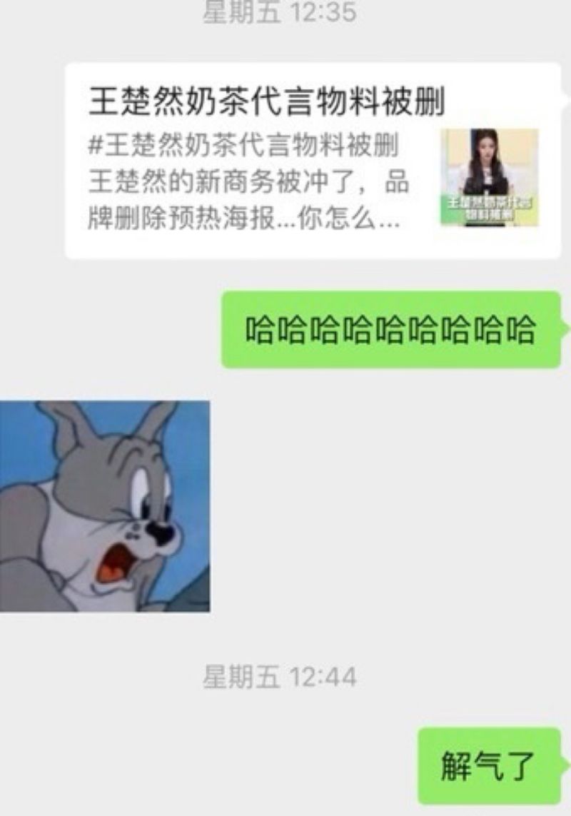 曬出自己之前和店家的聊天截圖,當時在7月29號,因為王楚然奶茶代言掉了,還特地發給店家,表示自己「解氣了」!當時店家也沒解釋👇