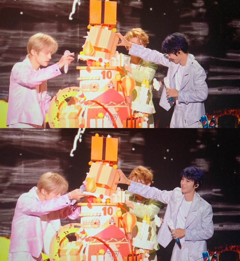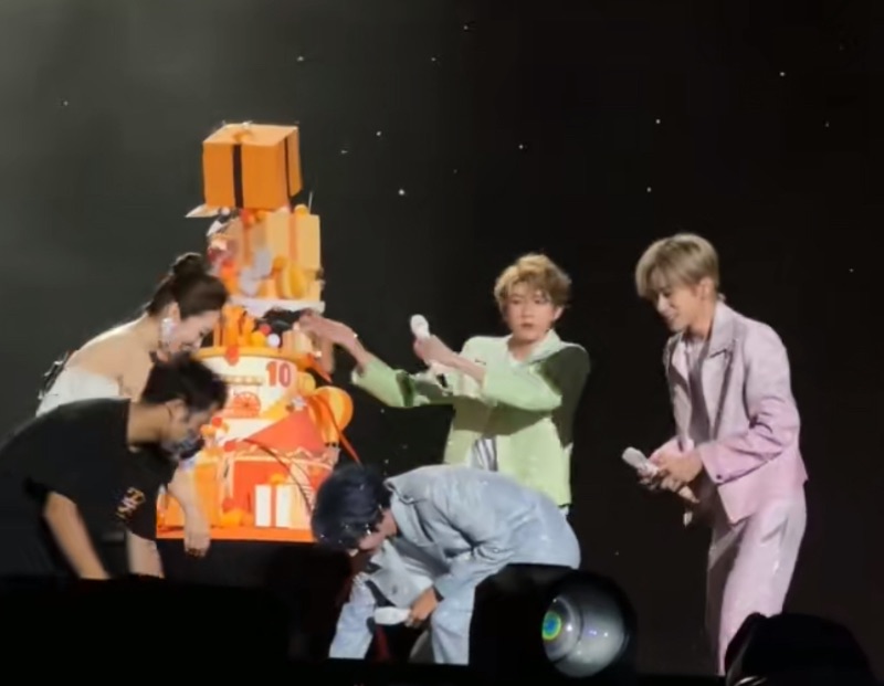 是達,按照慣例,每次都會在演唱會上切蛋糕,這次十週年蛋糕看起來真的好可愛,可是推出來時就歪歪扭扭,結果還在cue粉絲們把手機當蠟燭時,蛋糕⋯塌了!