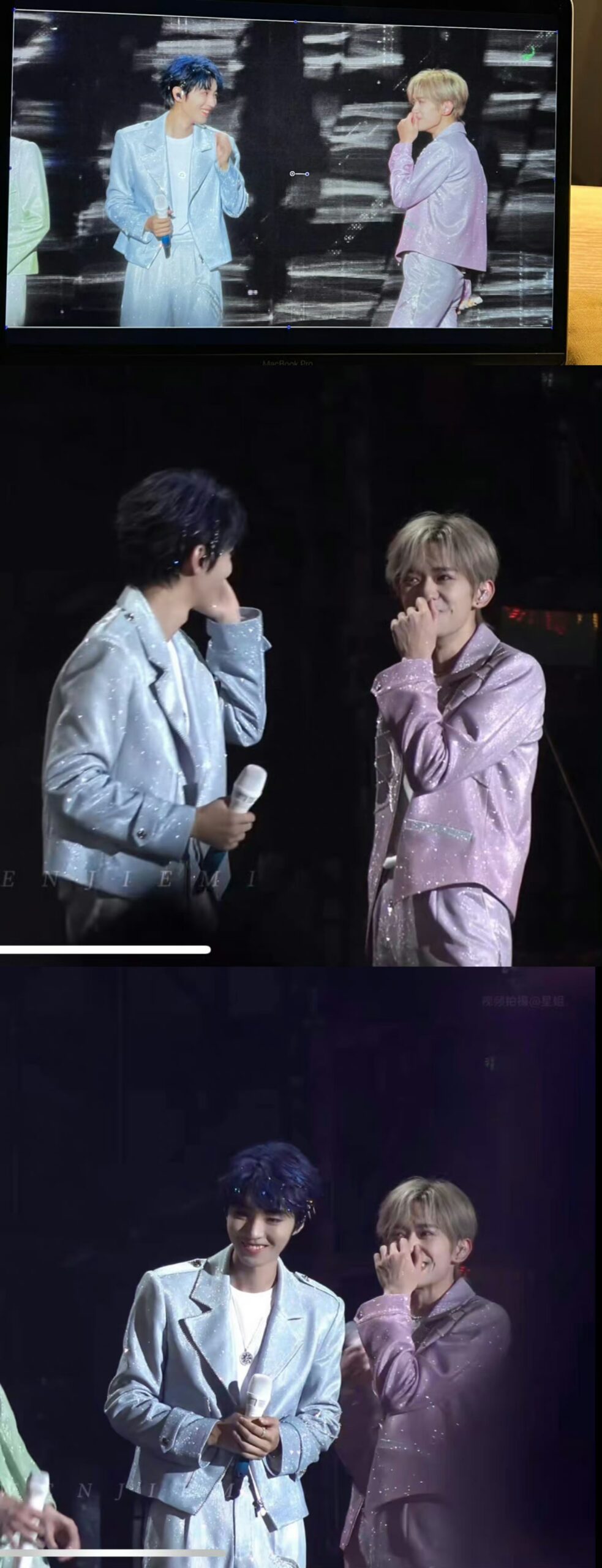 接著終於看見整場演唱會最鮮活的時刻,大家紛紛走過來企圖把蛋糕扶起來,王俊凱低腰撿蛋糕、易烊千璽也趕緊到另一邊扶住了蛋糕,王源則兩隻手在後面推著,就這樣三人好不容易把蛋糕重新扶起來了。