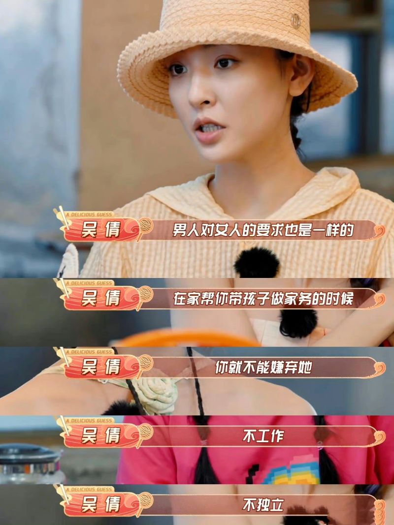 另外,吳倩在節目中提到了婚戀觀,表示當女人在家裡幫男人帶孩子做家務的時候,男人就不能嫌棄她不工作、不獨立👇