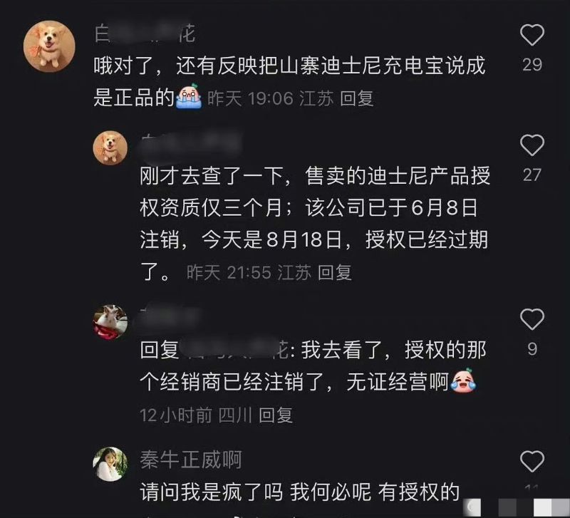 更有網友留言,表示她直播間賣的迪斯尼充電寶是山寨版,結果被牛姐回應:「請問我是瘋了嗎?我何必呢?有授權的。」但在網友表示授權的經銷商早註銷的留言之後,直接裝死不回應了👇