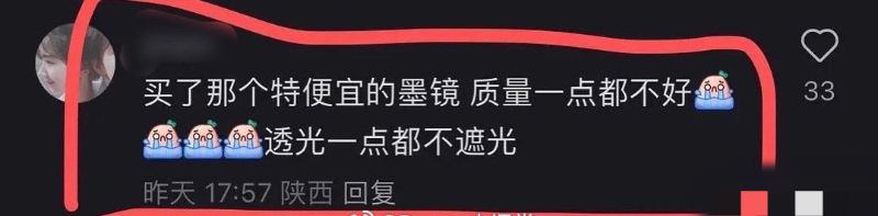 來看看到底怎麼一回事?原來有網友發現,有買家在秦牛正威直播間投訴,表示自己買的那個特便宜的墨鏡一點都不遮光👇