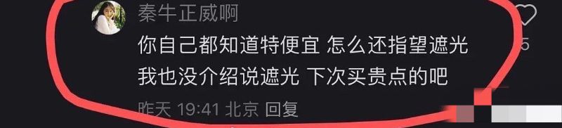 沒想到看到買家差評,牛姐居然直接下場回復:「你自己都知道特便宜,怎麼還指望遮光?我也沒介紹說遮光,下次買貴點的吧!」(⊙o⊙)… 這,墨鏡不遮光,拿來幹啥呢這是?