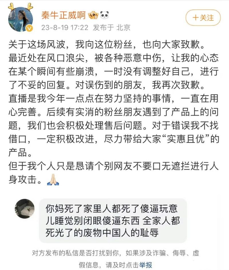 隨著上熱搜,秦牛正威發文道歉,表示最近心態有點崩潰,沒調整好自己👇