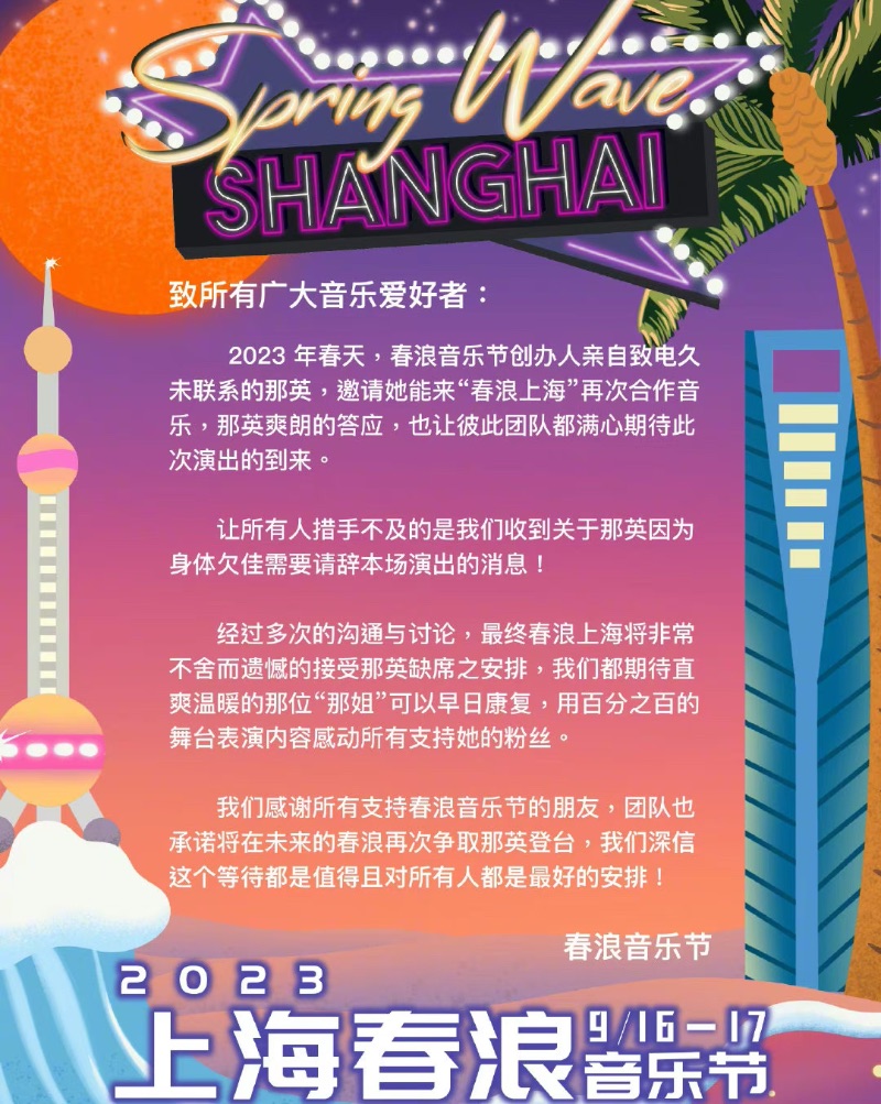 但,或許是討論度太高,原本那英有份參與的音樂節,發文表示那英因為「身體因素問題」請辭了音樂節!
