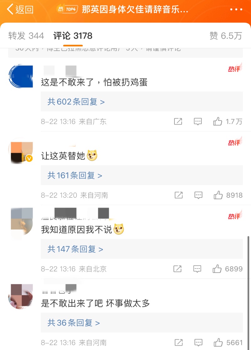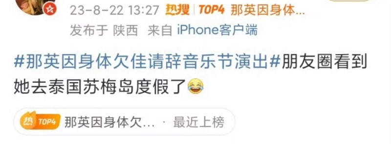 但,或許是討論度太高,原本那英有份參與的音樂節,發文表示那英因為「身體因素問題」請辭了音樂節!