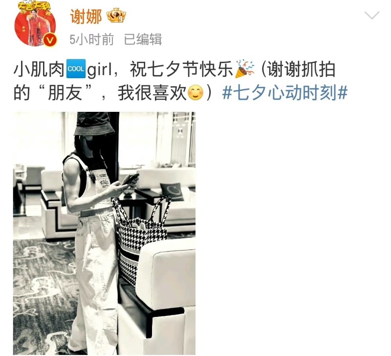 今年七夕,謝娜繼續狗糧轟炸,不過這次顯得有點低調,曬出了拍到自己手臂肌肉的照片,表示謝謝抓拍的「朋友」。