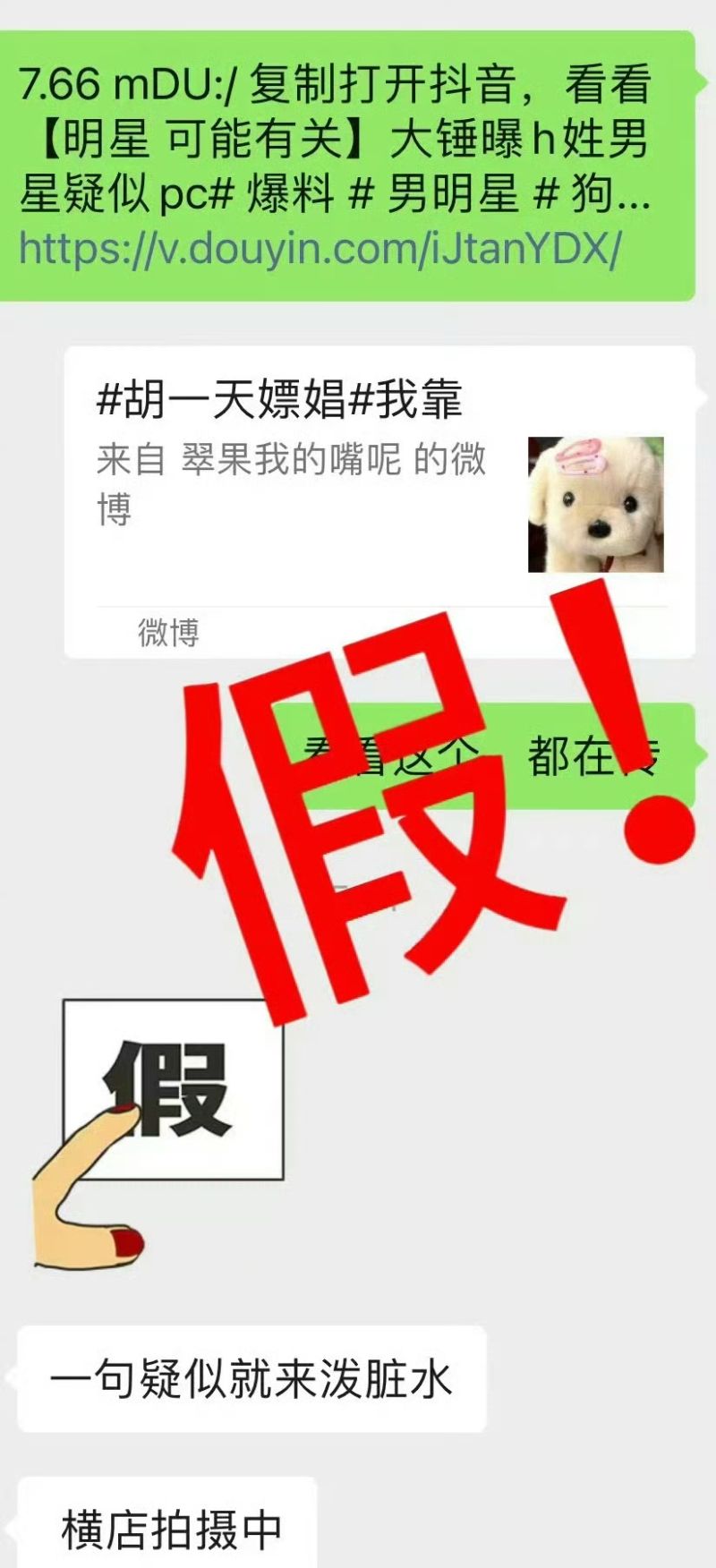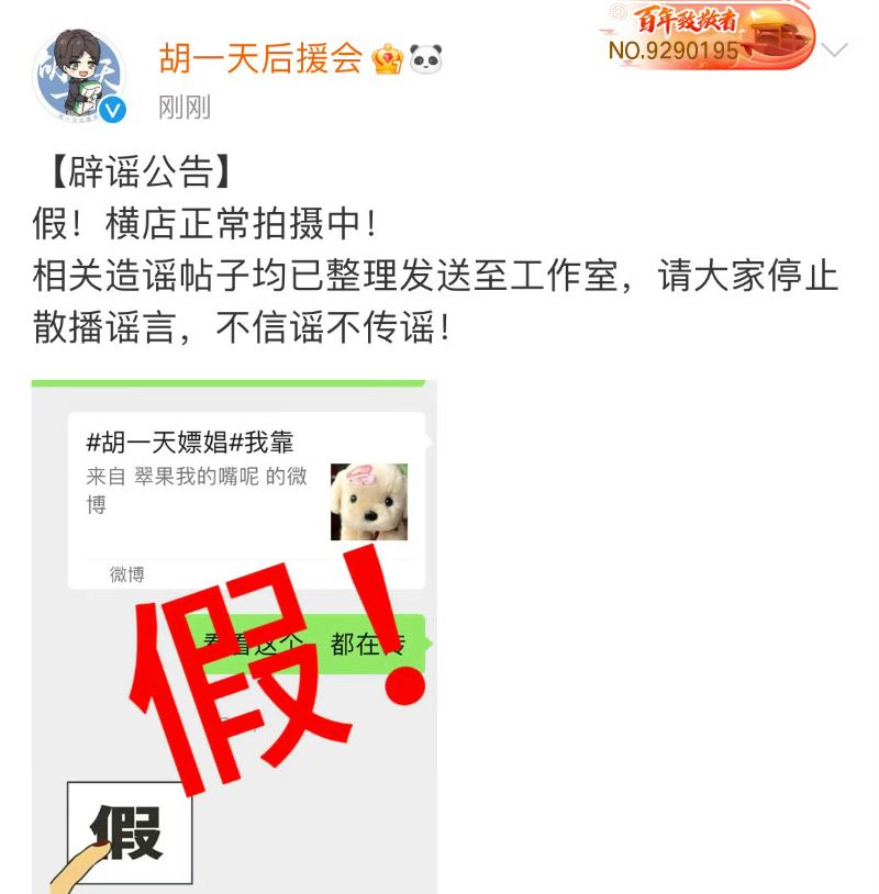 在網友們瘋傳之後,胡一天後援會發聲明闢謠,表示胡一天還在橫店正常拍攝中👇