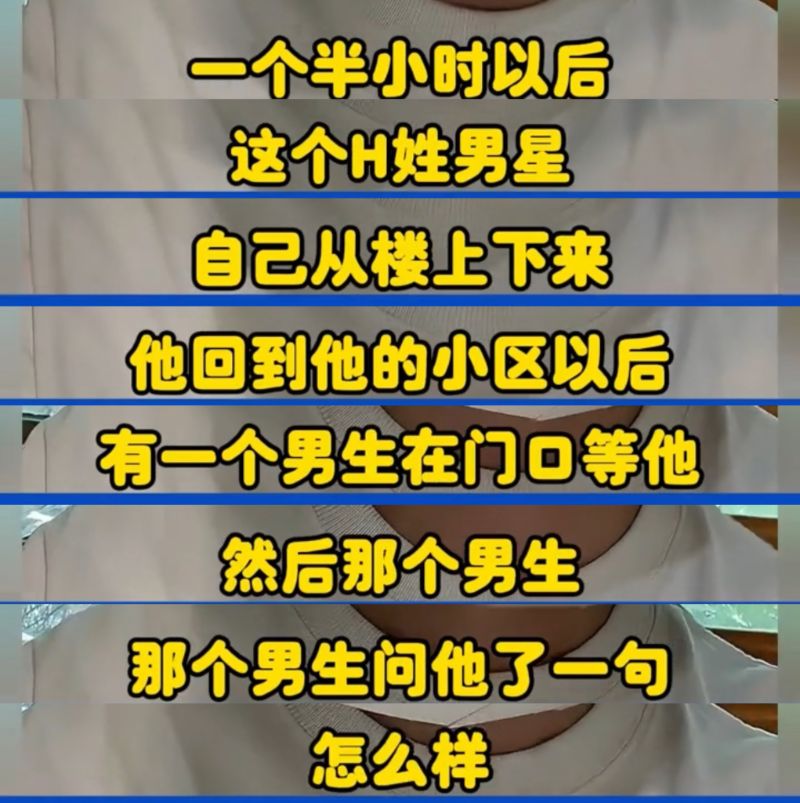 過了一個半小時之後,這個H姓男星自己從樓上下來,回到自己的小區,和同住的男生會合。狗仔表示自己聽見了該男生問H姓男星:「怎麼樣?」懷疑該H姓男星嫖娼!
