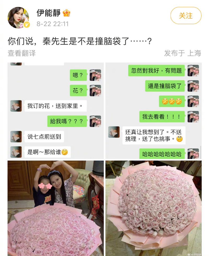 難得浪漫的七夕,伊能靜卻發文問網友:「你們說,秦先生是不是撞腦袋了……?」曬出了自己和秦昊的聊天截圖,還有收到的七夕禮物👇