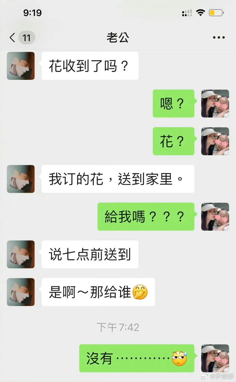 只見秦昊問伊能靜收到花了嗎?滿頭霧水的伊能靜還反問:「給我嗎???」更當場懷疑其目的,兩人對話超爆笑👇