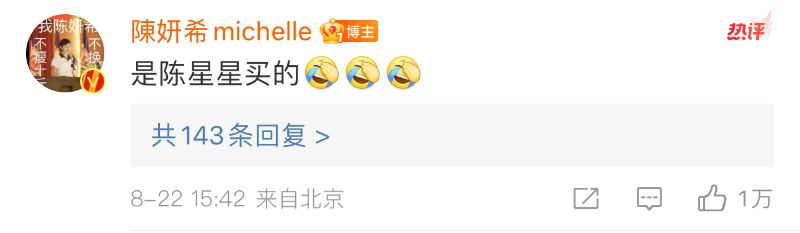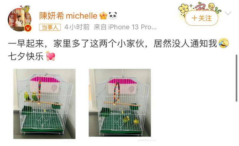 網友紛紛猜測是丈夫陳曉送的,甚至「陳曉送陳妍希的七夕禮物」都上了熱搜,認為陳曉送了一對愛情鳥給老婆。結果沒想到卻被陳妍希闢謠,表示是兒子陳星星買的👇