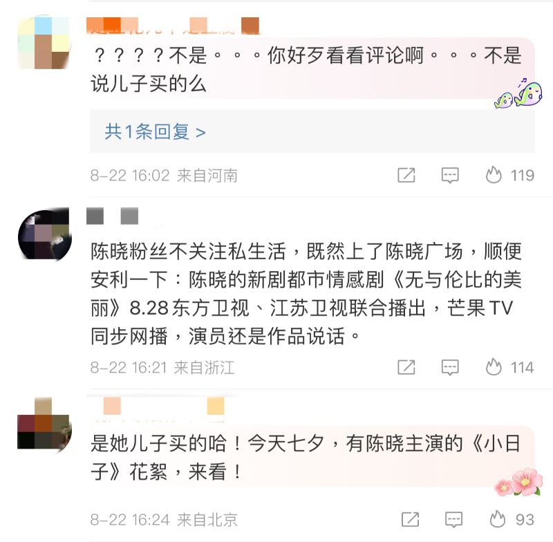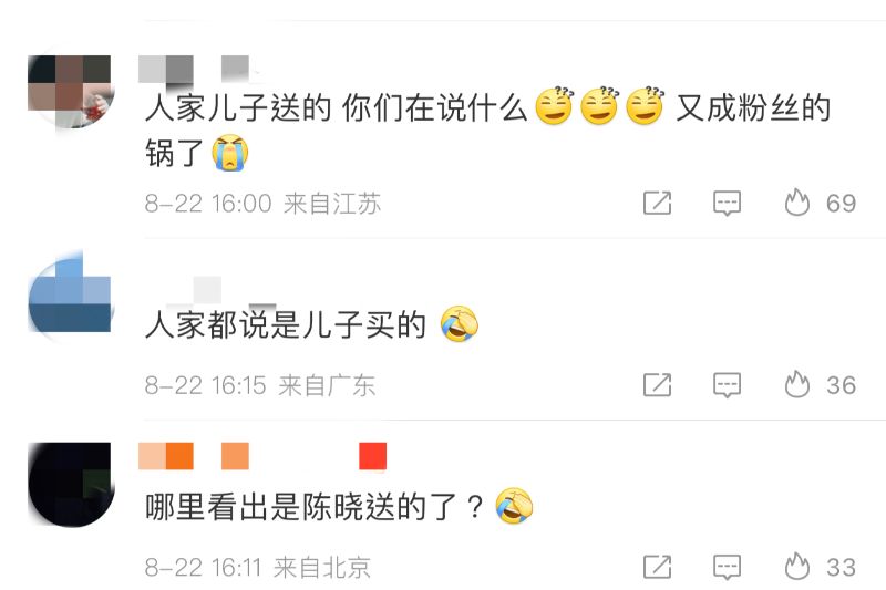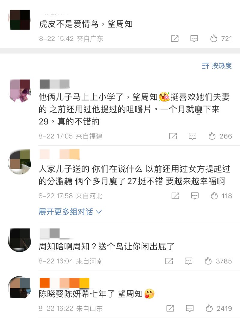 而陳妍希評論區也很尷尬,有網友留言「虎皮不是愛情鳥,望周知」,結果被兩派網友在開懟~一派認為人家夫妻都結婚7年了,還周知啥啊?一派則拼命解釋是兒子送的,別帶陳曉👇