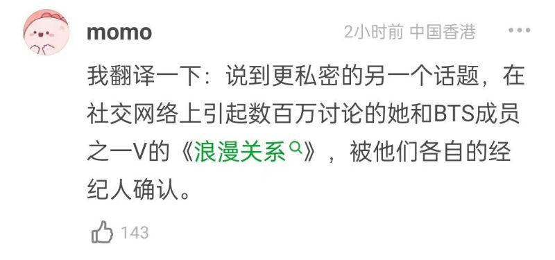 來看看,有網友發現在雜誌訪問最尾端,提到了有關她和BTS成員V的“浪漫關係”,被雙方經紀人確認了!