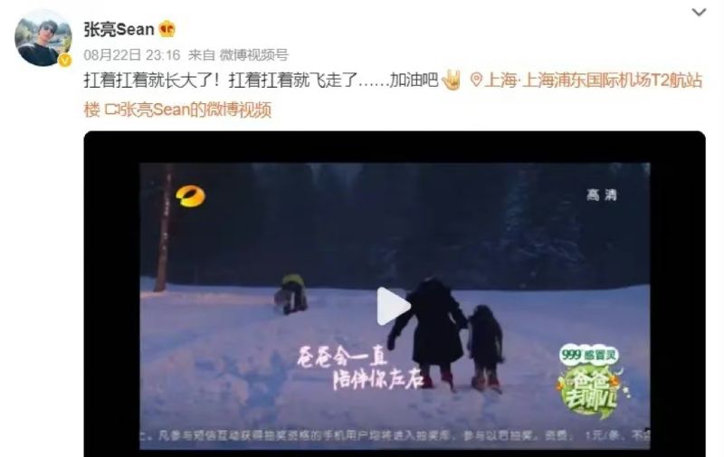 沒想到一轉眼,天天現在已經15歲(11月12日後16歲),居然也要出國留學去啦!張亮日前曬出一段視頻,讓人十分感觸!只見張亮配文:「扛著扛著就長大了!扛著扛著就飛走了……加油吧!」並坐標上海國際機場!