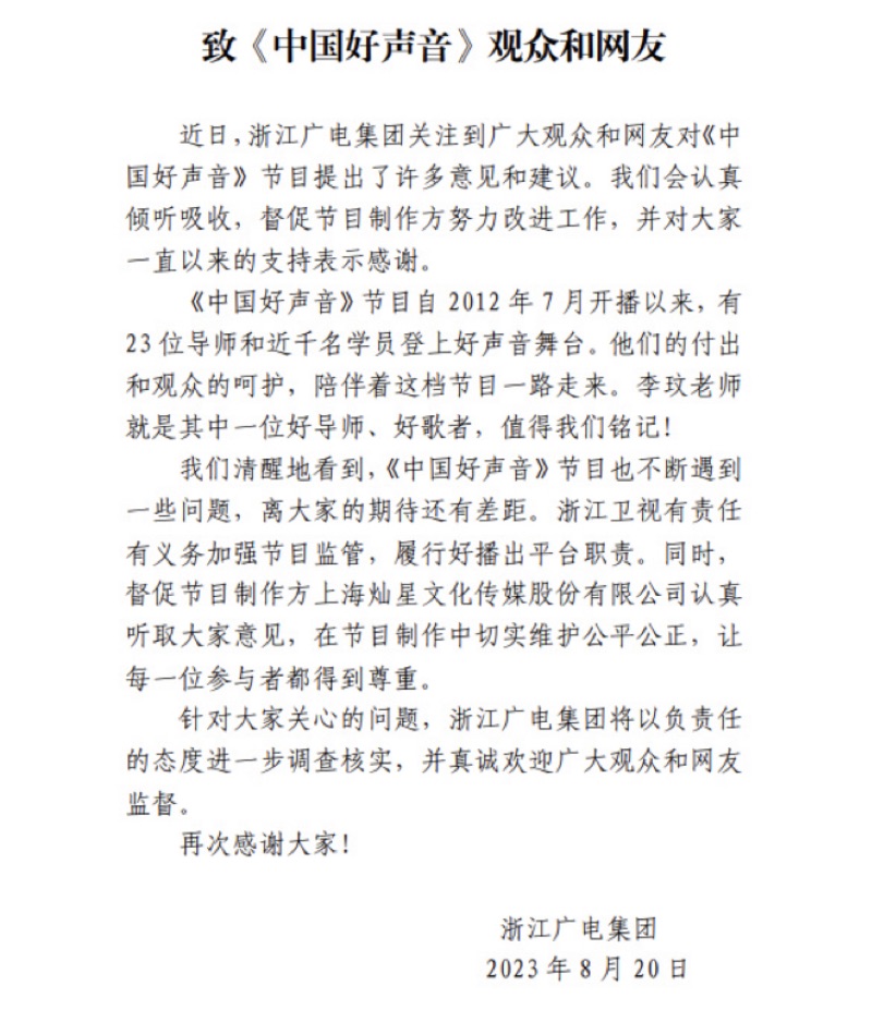雖然浙江廣電第一時間回應,但連公章都沒蓋上的聲明,讓網友認為根本是在敷衍,而且節目繼續正常播出,甚至還上了個「中國好聲音收視率第一」的熱搜,引起更多負面評價!