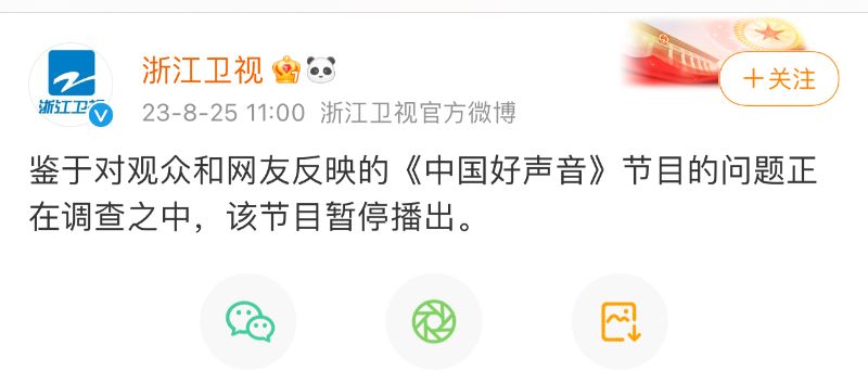 隨著不少網友聲言抵制,甚至到相關廣告商評論區留言抗議之後,浙江衛視第一次以官方賬號回應,表示《中國好聲音》節目的問題正在調查之中,該節目將暫停播出。不過,《中國好聲音》官博並未有任何聲明,目前也未知會暫停多久,對這一屆學員有什麼影響等,一切還需等官方聲明。