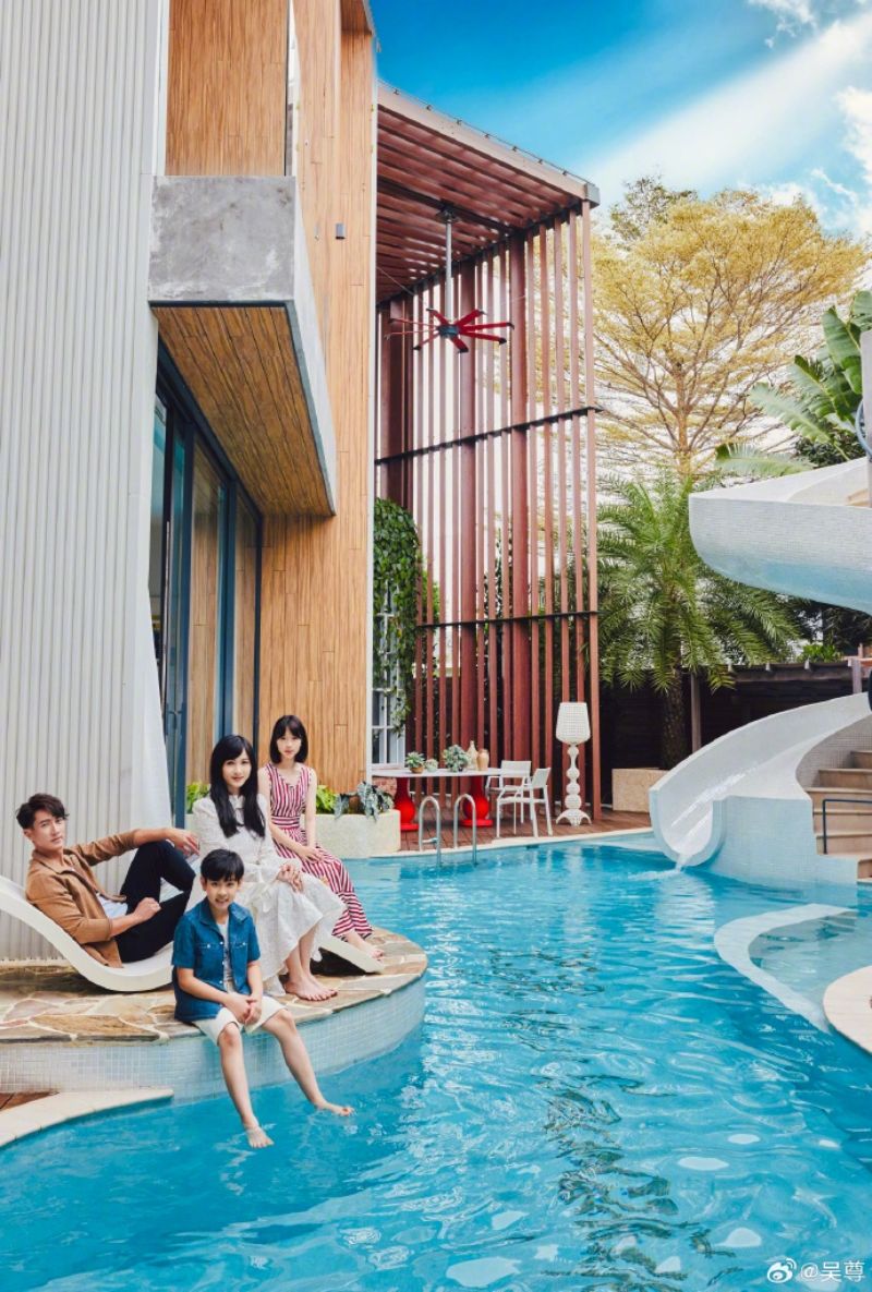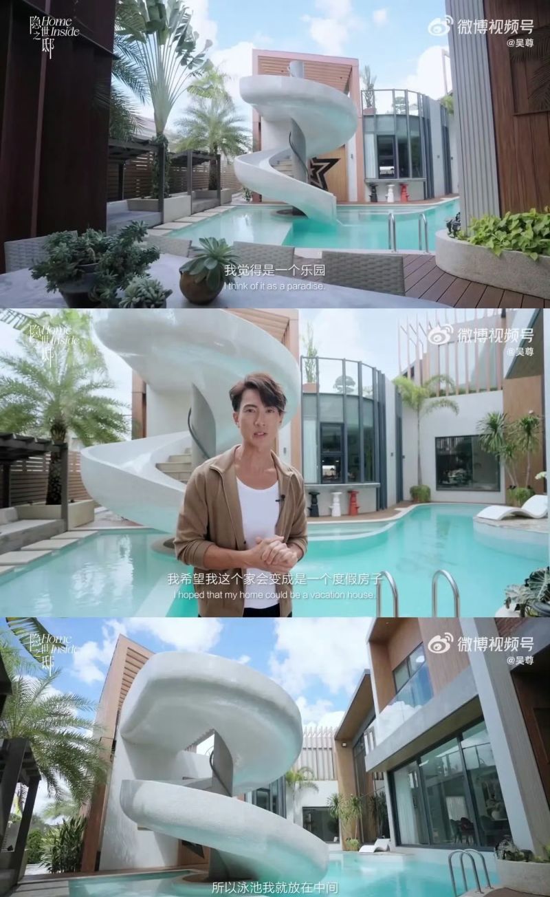 從開箱視頻中可以看見,吳尊想把自己的家,打造成一個樂園,一個有度假feel的房子,所以他將泳池擺在了房子中間,不管從房子哪個角度,都可以看見這個泳池。