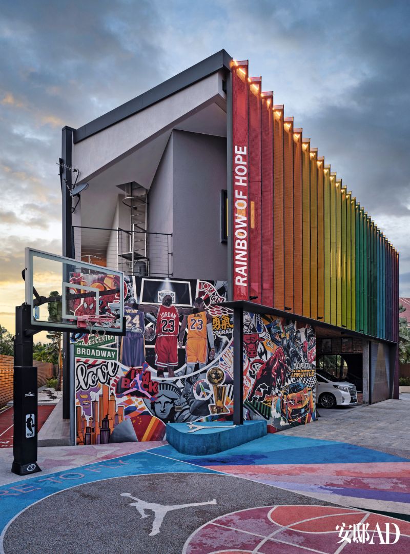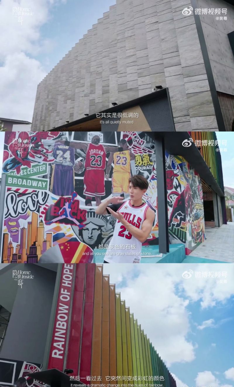 當然少不了他最愛的籃球場,外面一大片的塗鴉墻也出自吳尊之手👇
