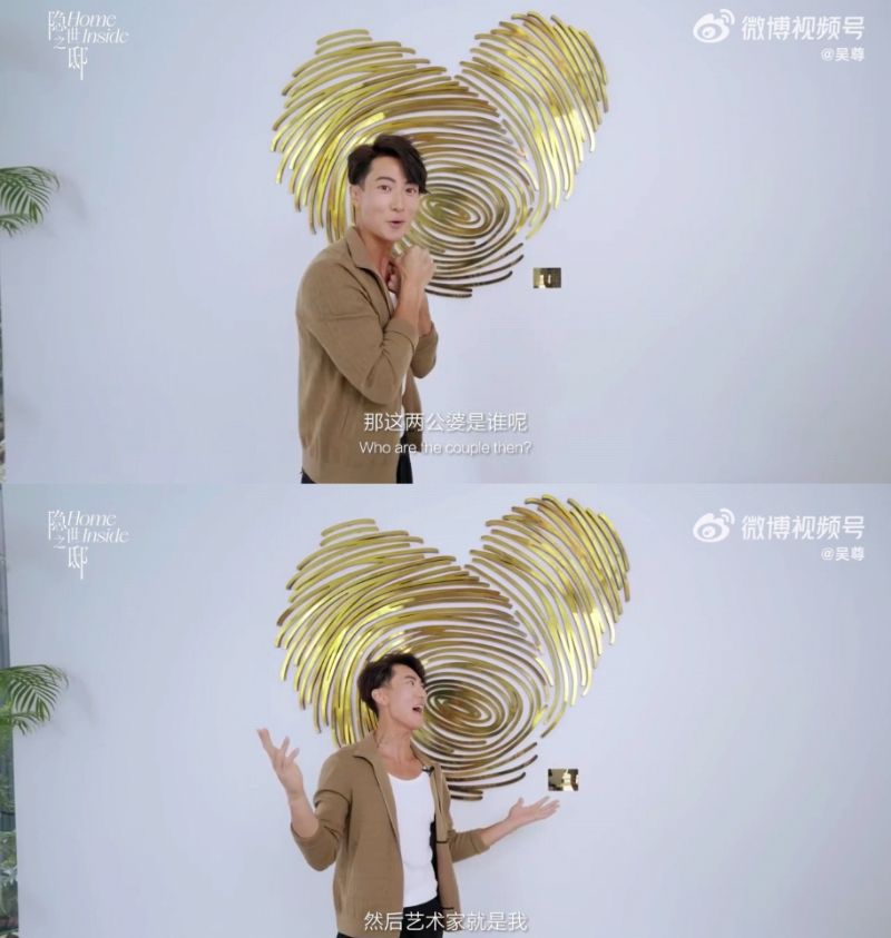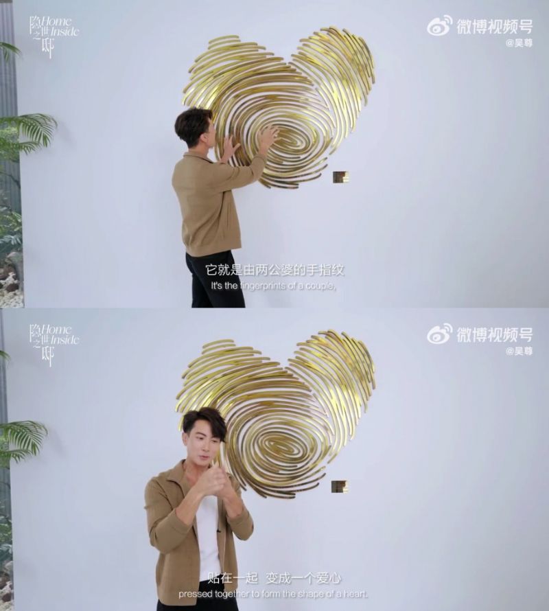 而在墻上展示的這幅”藝術品“,則出自吳尊手裡,就是用自己和太太的手指紋,設計出一個愛心形狀的藝術品~