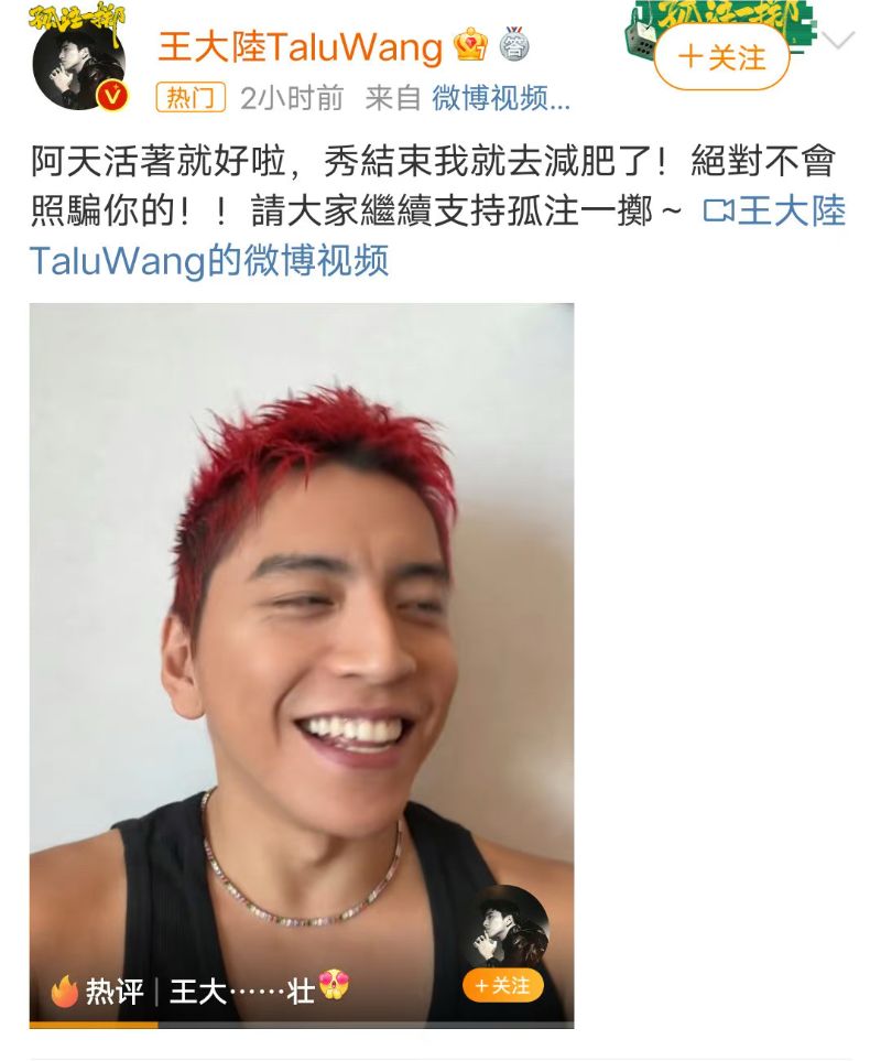 隨著上了熱搜,王大陸也上線回應啦~~高情商表示「秀結束我就去減肥了!」還順帶宣傳了一波《孤注一擲》,果然是宣傳小能手啊!
