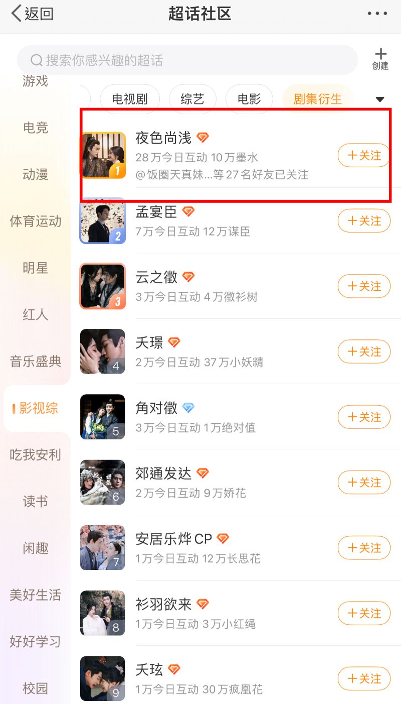 先來看看到底這對副CP有多出圈?在電視劇衍生的超話排行榜,「夜色尚淺」目前排名第一!而虞書欣和張凌赫的「衫羽欲來」僅排名第8!