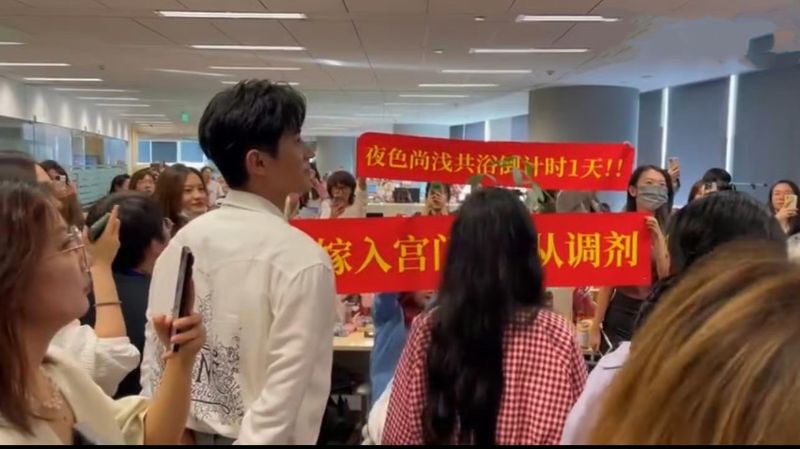 先來看看掃樓部分,可以說夜色尚淺果然人氣不錯,新浪辦公室中有不少支持者,拉布條迎接「一家三口」超可愛!