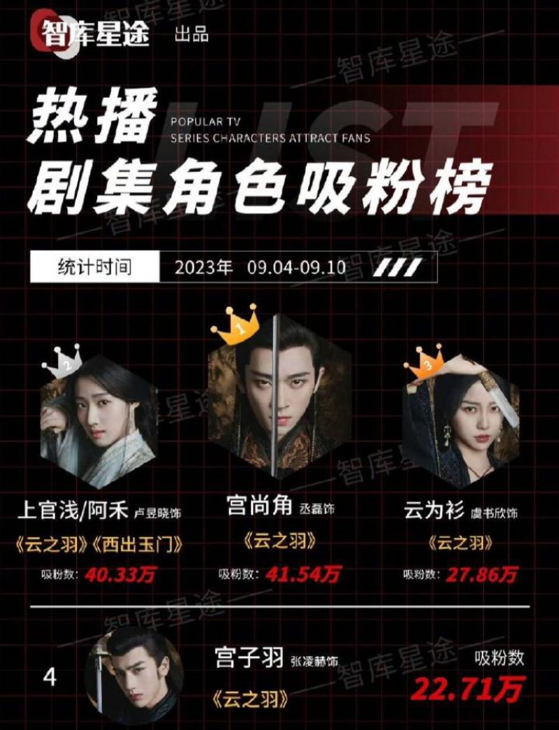 而在最新的熱播劇集角色吸粉榜上,丞磊靠著宮尚角位居冠軍,盧昱曉靠著上官淺排名第二,虞書欣吸粉力僅排第三,至於男主張凌赫更虐,居然排在了第四名!