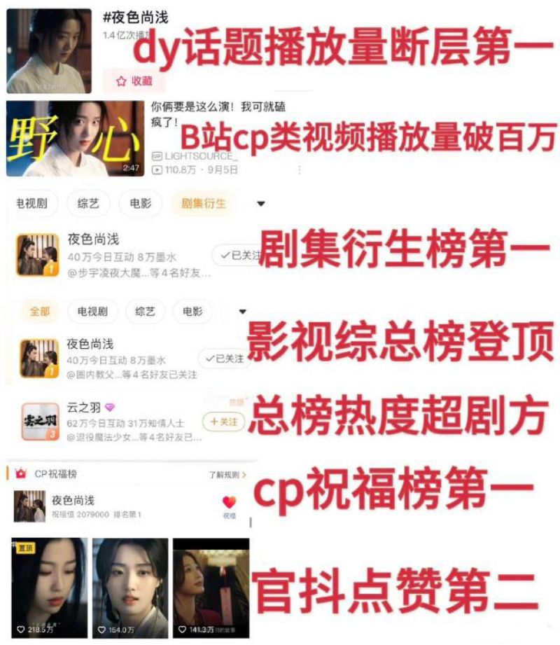 在抖音和B站部分,夜色尚淺的播放量也遠超過衫羽欲來,來看粉絲整理的成績👇