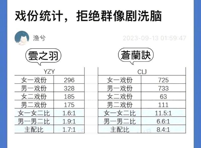 隨著越來越多網友熱議這對副CP,就有粉絲將《雲之羽》和《蒼蘭訣》主演戲份時長做了對比,抗議導演將大女主劇,改成了群像劇!