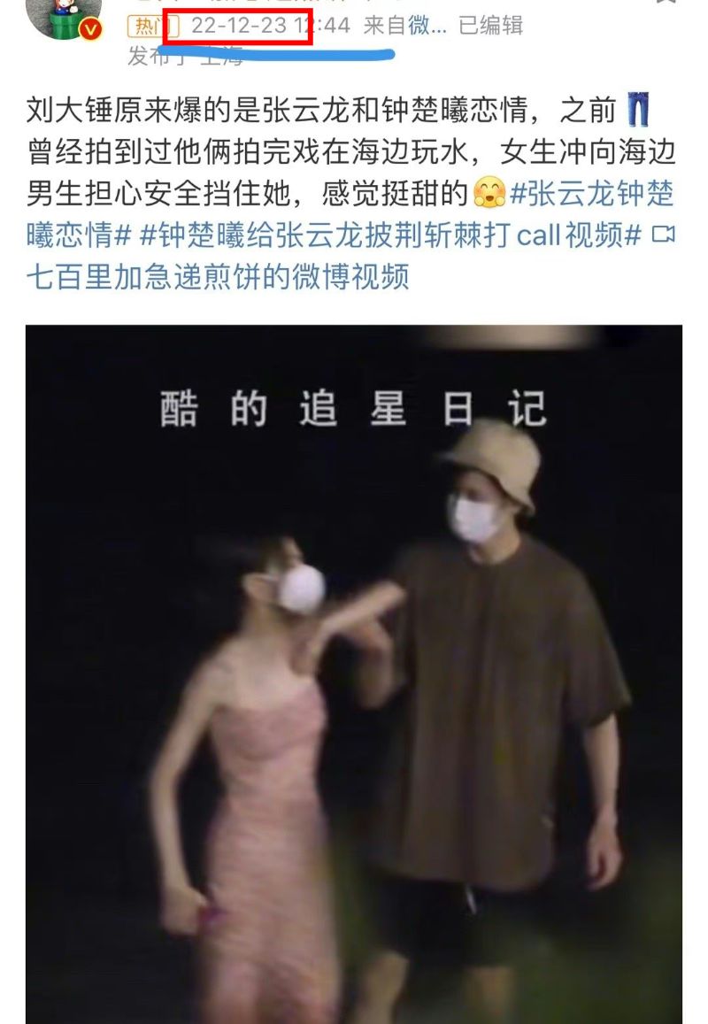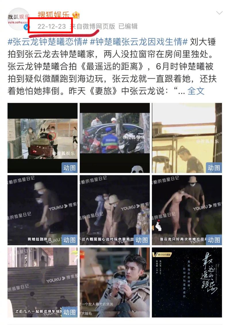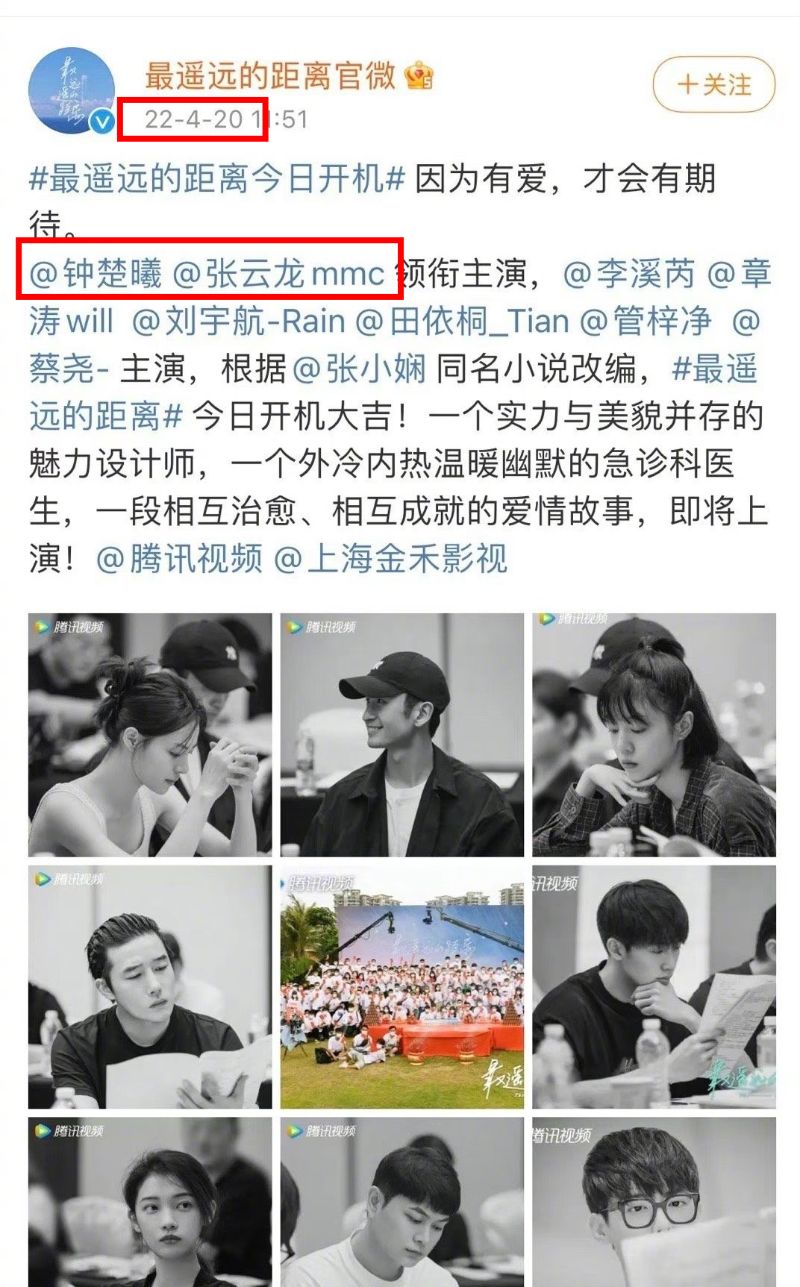 這就來整理一下時間線,鐘楚曦和張雲龍是在22年4月開始合作拍攝《最遙遠的距離》👇