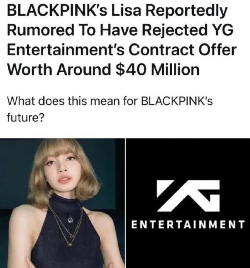 該媒體還聲稱LISA拒絕了YG Entertainment的兩份合同提議,有傳言稱她已經拒絕了YG的第一份提議,最近又拒絕了第二份提議。合同金額傳聞價值500億韓元(約合3,770萬美元)。
