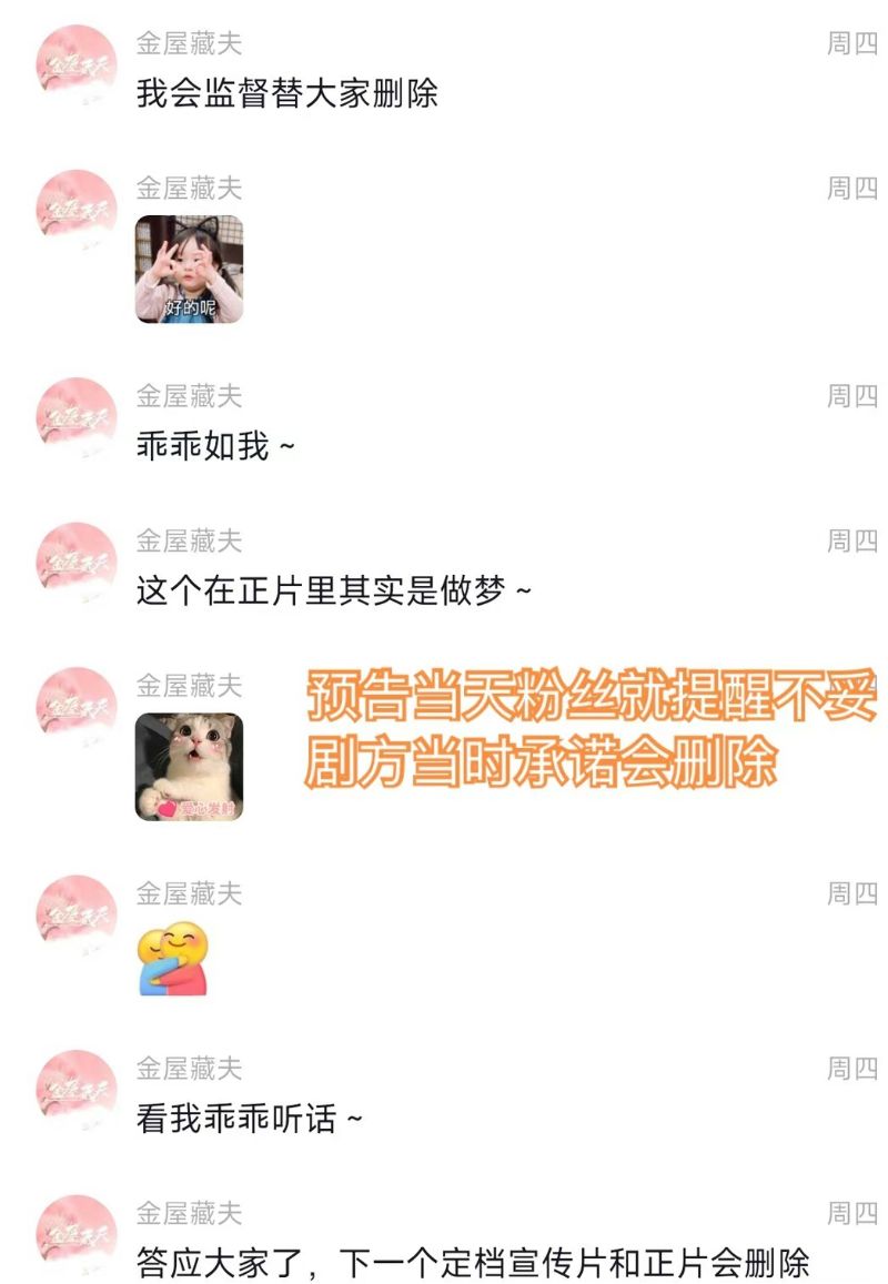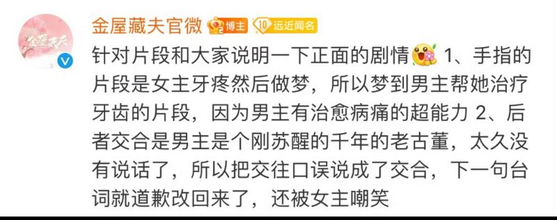 引起爭議之後,《金屋藏夫》官微回應道:「手指的片段是女主牙疼然後做夢,夢到男主幫她治療牙齒的片段」,「“交合”是男主是個剛蘇醒的千年的老古董,太久沒有說話了,所以把“交往”口誤說成了‘交合’”。」解釋全文如下👇