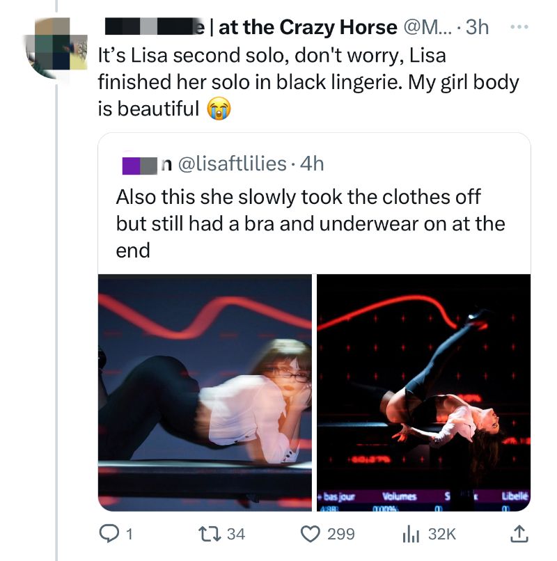 重點來啦~最多人關心的就是,到底LISA在瘋馬秀的表演尺度到什麼程度?答案是…比基尼,沒有全裸,但有表演脫衣服的過程👇