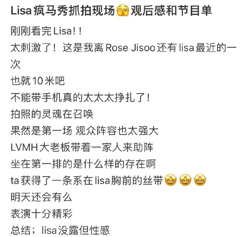 首秀完成!沒錯,可以說不僅是KPOP界,只要關心娛樂圈的網友都在吃瓜的「LISA瘋馬秀」,終於完成了第一場首秀,接下來還有四場!!!!
