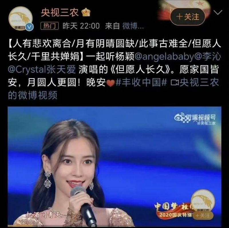 該微博號原本配合中秋節,發了一則楊穎唱《但願人長久》的視頻貼文,不過現在相關貼文已經找不到了👇