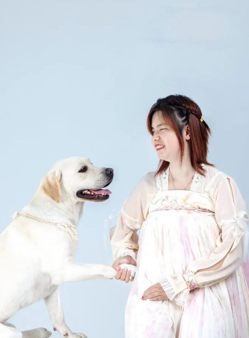你能帶著你的愛犬 穿著淡藍色的裙子 梳著紅色的辮子配上正藍色的辮尾