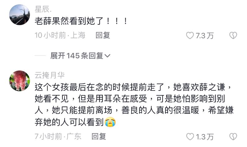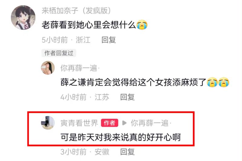 有網友在她的評論區留言,猜測老薛看到她心裡會想什麼?結果有人表示「或許會覺得給這個女孩添麻煩了」,但小姐姐回應表示:「可是昨天對我來說真的好開心啊!」