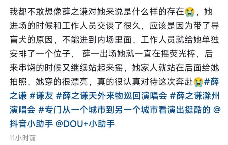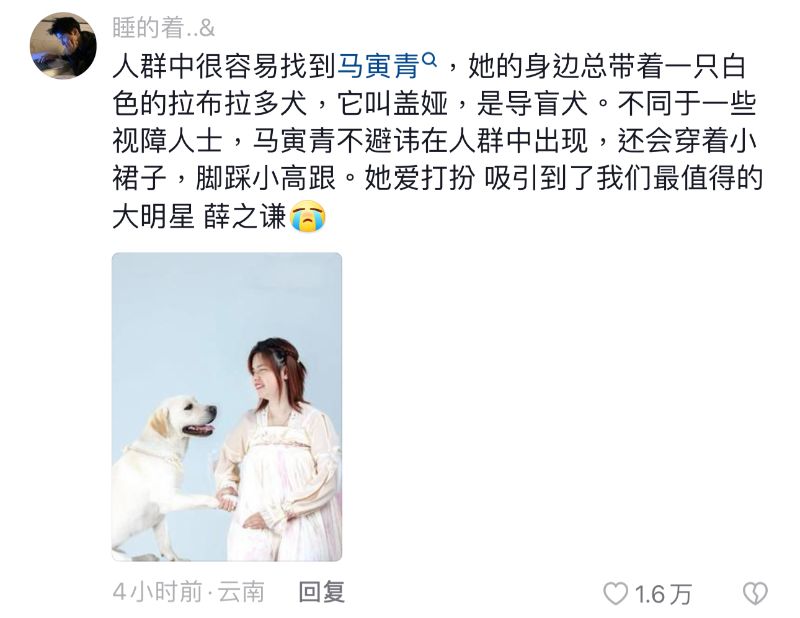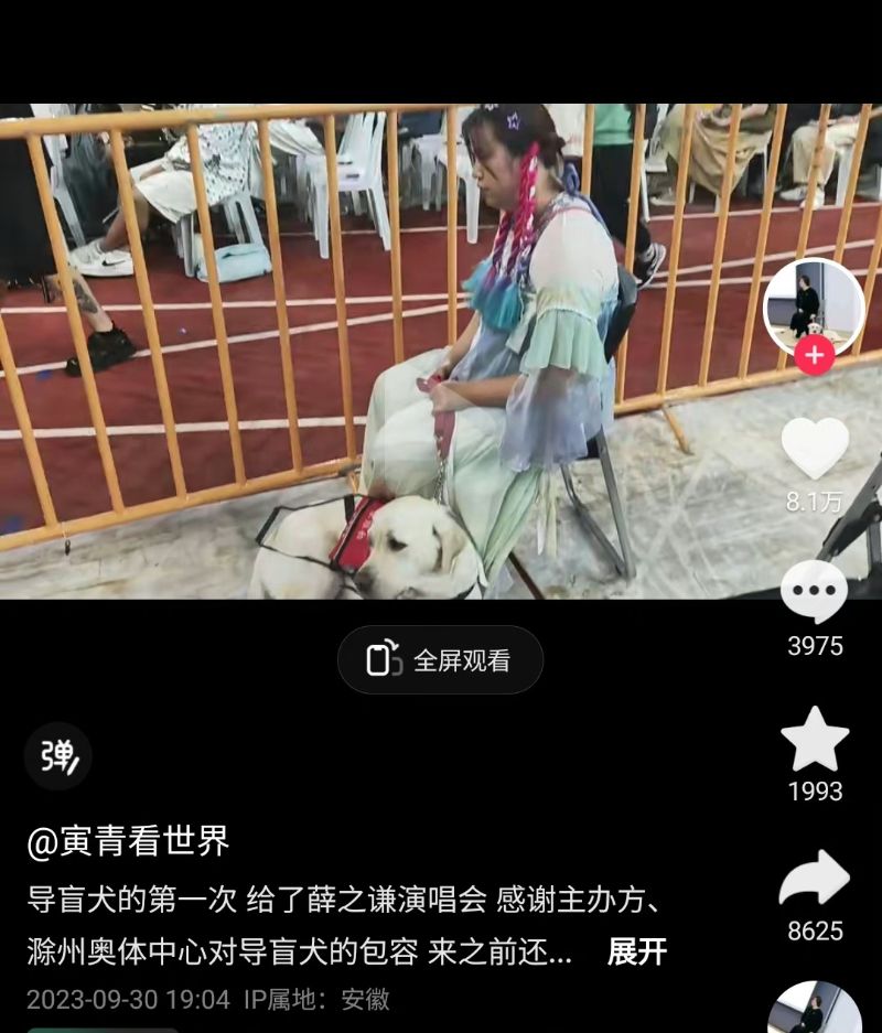 而在最新的滁州演唱會上,卻來了個特別的粉絲,那就是一位牽著導盲犬的視障女孩。這位網名叫「寅青看世界」的女孩,因為有視覺障礙,需要依靠導盲犬來指路,結果在薛之謙演唱會,獲得了現場工作人員的貼心安排,那就是單獨為他們安排到一個區域,感動了不少網友。