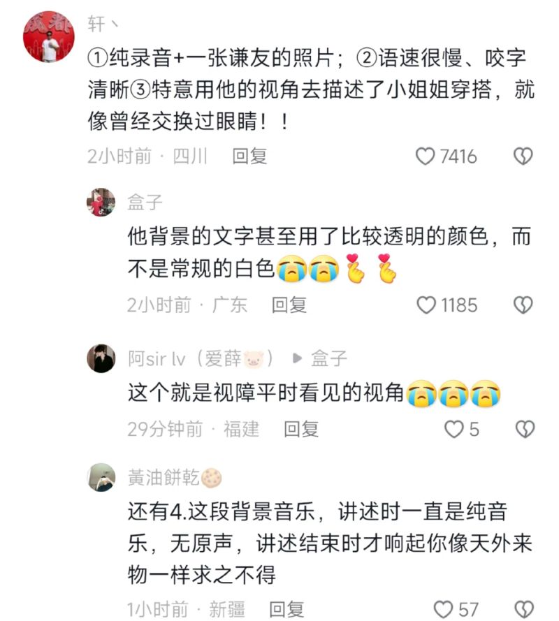 對於老薛這段語音,粉絲表示他真的很用心,不但特別用了純錄音,說話語速還特別放慢,還特意用了自己的視角去描述了小姐姐的穿搭,就像曾經交換過眼睛。更有網友發現,這則語音的背景文字顏色,甚至不是常規的白色,而是對視障朋友比較友好的透明色。