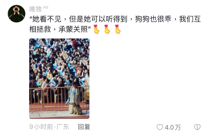 有網友拍攝到在演唱會快要結束的時候,這位小姐姐拉著導盲犬,在工作人員的指引下離場,拍攝的網友表示,當時看到覺得特別感動。