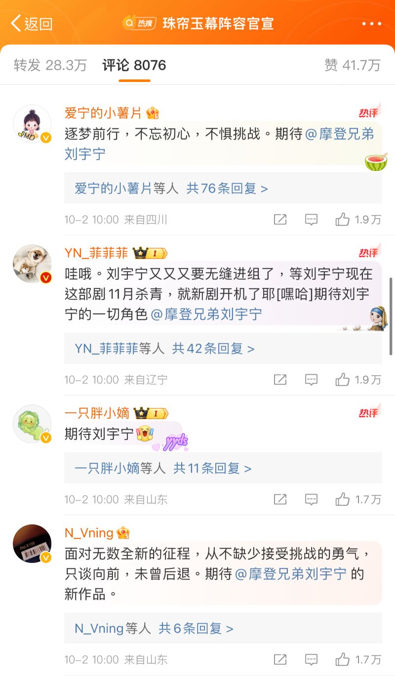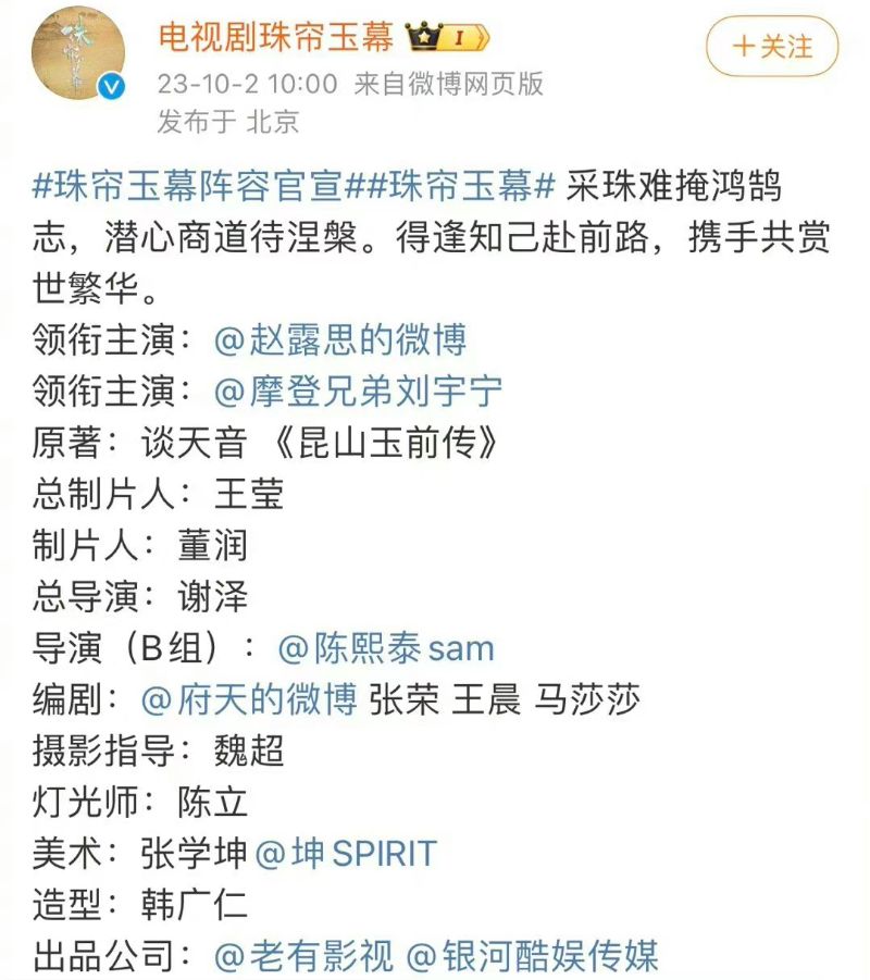 雖然粉絲全力抵制,但…劇組還是在2號這天空降,官宣了《珠簾玉幕》的完整陣容啦!這裡看看,趙露思果然是一番女主,而劉宇寧則是二番!