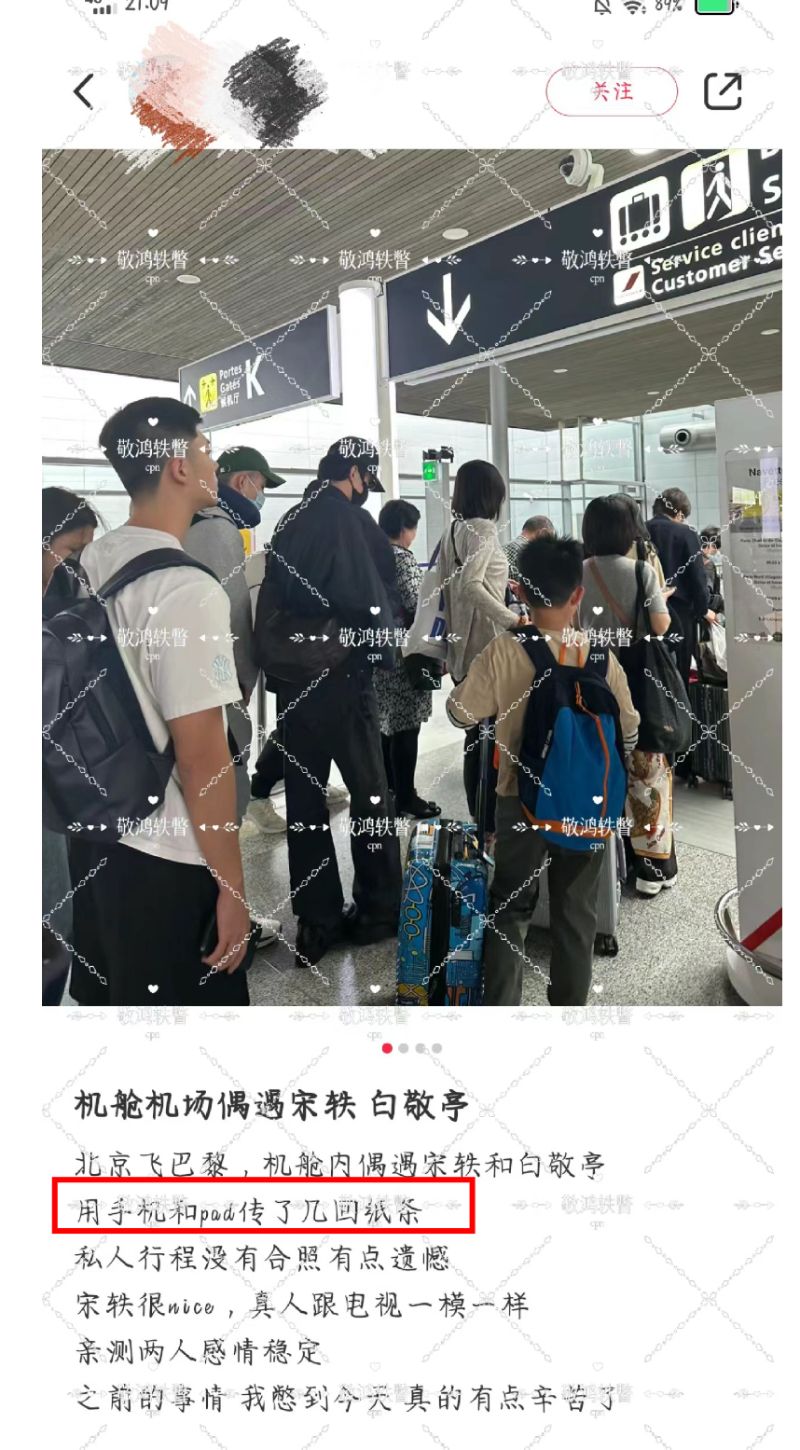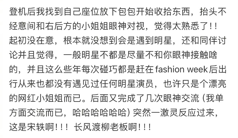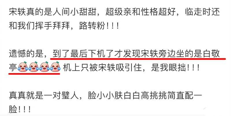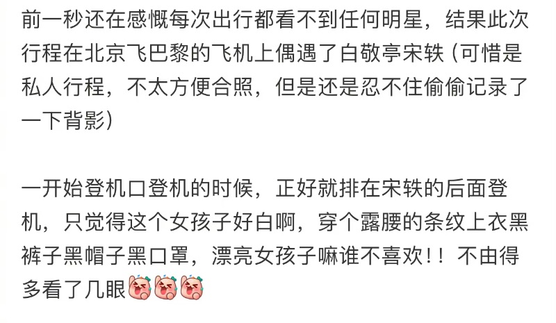 消息曝光之後,由於沒有兩人同框照,立刻被質疑真實性~結果,輔助這不就登場了~有網友扒出,早在幾天前就有網友發了自己在飛往巴黎的班機上,巧遇了宋軼,驚艷了一整個飛行旅程,最後下機前才赫然發現…隔壁坐著的就是白敬亭!